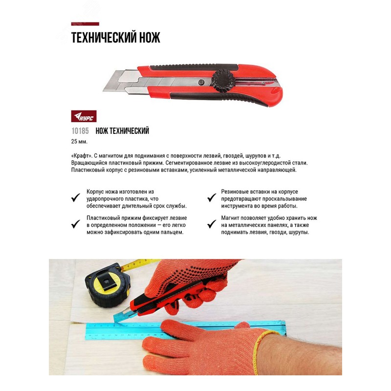 - Преимущества:лезвие из высокоуглеродистой инструментальной стали позволяет резать широкий спектр материалов|вращающийся пластиковый прижим прочно фиксирует лезвие в необходимом положении|металлическая направляющая усиливает конструкцию ножа|встроенный магнит позволяет фиксировать нож на металлических поверхности, а также поднимать различные металлические предметы