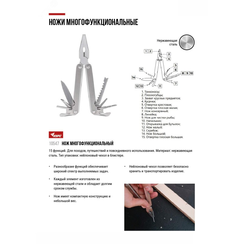 - Преимущества:разнообразие функций обеспечивает широкий спектр выполняемых задач|каждый элемент изготовлен из нержавеющей стали и обладает длительным сроком службы|нож имеет компактную конструкцию и небольшой вес|нейлоновый чехол позволяет безопасно хранить и транспортировать изделие