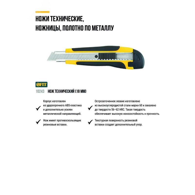- Преимущества:лезвие из высокоуглеродистой инструментальной стали позволяет резать широкий спектр материалов|15 сегментов лезвия способствуют сохранению остроты долгое время|металлическая направляющая усиливает конструкцию ножа|корпус из ударопрочного ABS пластика выдерживает высокие механические нагрузки|резиновая накладка на корпусе предотвращает проскальзывание во время работы