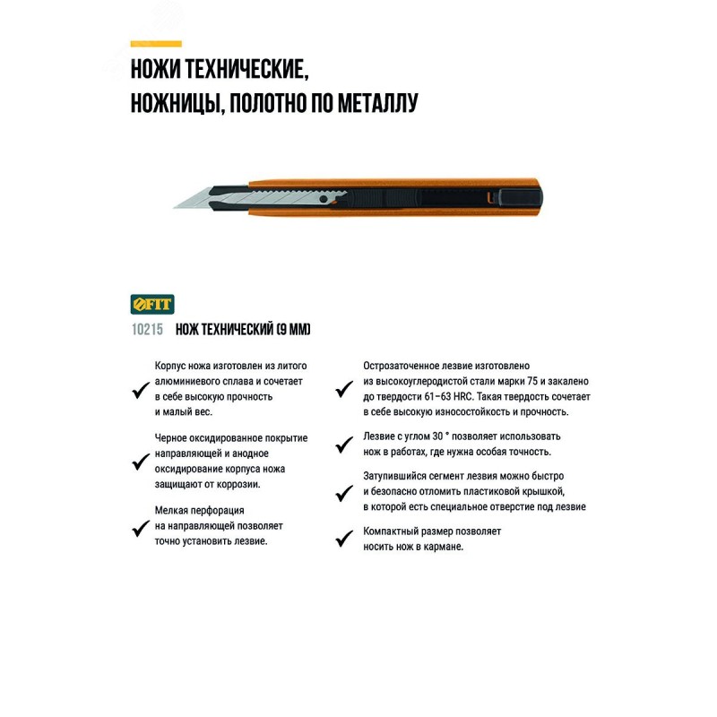 лезвие ножа закалено до твердости 61-63 HRC и обладает высокой прочностью и износостойкостью|острый угол 30 градусов способствует высокой точности выполнения работы|направляющая с мелким шагом перфораций повышает точность установки лезвия|черное оксидированое покрытие направляющей предотвращает коррозию|эргономичный корпус из алюминиевого сплава сочетает в себе малый вес и высокую прочность