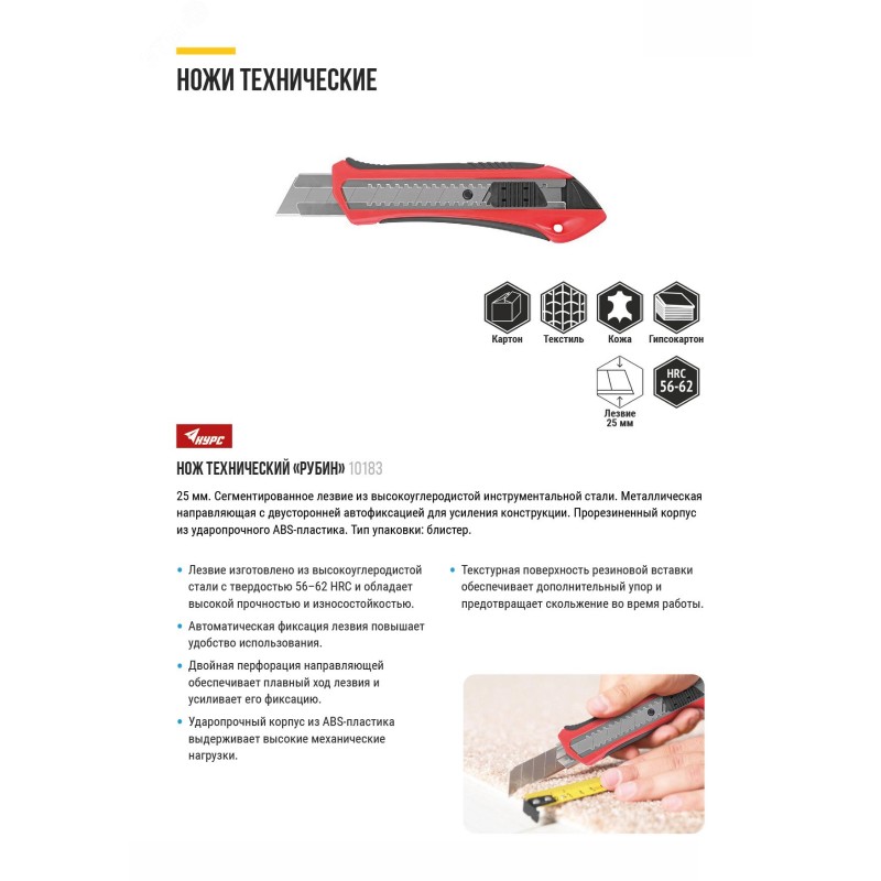 - Преимущества:лезвие изготовлено из высокоуглеродистой стали с твердостью 56-62 HRC и обладает высокой прочностью и износостойкостью|автоматическая фиксация лезвия повышает удобство использования|двусторонняя перфорация направляющей повышает прочность фиксации|ударопрочный ABS пластиковый корпус выдерживает высокие механические нагрузки|текстурная поверхность резиновой вставки обеспечивает дополнительный упор и предотвращает проскальзывание во время работы