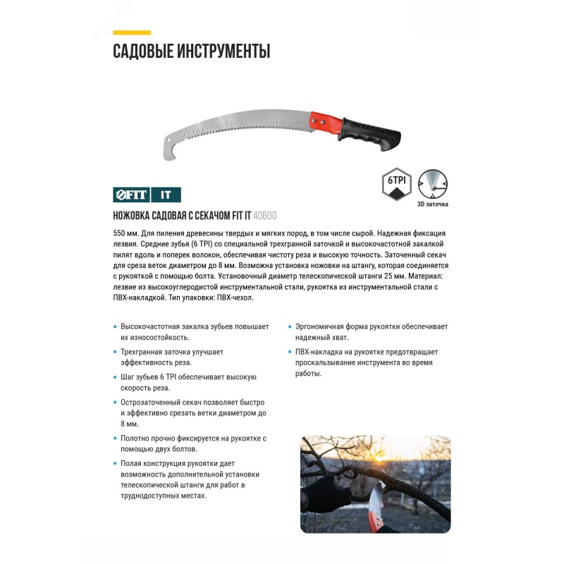 Ножовка садовая с секачом FIT IT предназначена для пиления древесины твердых и мягких пород, в том числе сырой. Высокочастотная закалка зубьев повышает их износостойкость. Трехгранная заточка улучшает эффективность реза. Шаг зубьев 6 TPI обеспечивает высокую скорость реза. Острозаточенный секач позволяет быстро и эффективно срезать ветки диаметром до 8 мм. Полотно прочно фиксируется на рукоятке с помощью двух болтов. Полая конструкция рукоятки дает возможность дополнительной установки телескопической штанги для работ в труднодоступных местах. Эргономичная форма рукоятки обеспечивает надежный хват. Накладка ПВХ на рукоятке предотвращает проскальзывание инструмента во время работы.