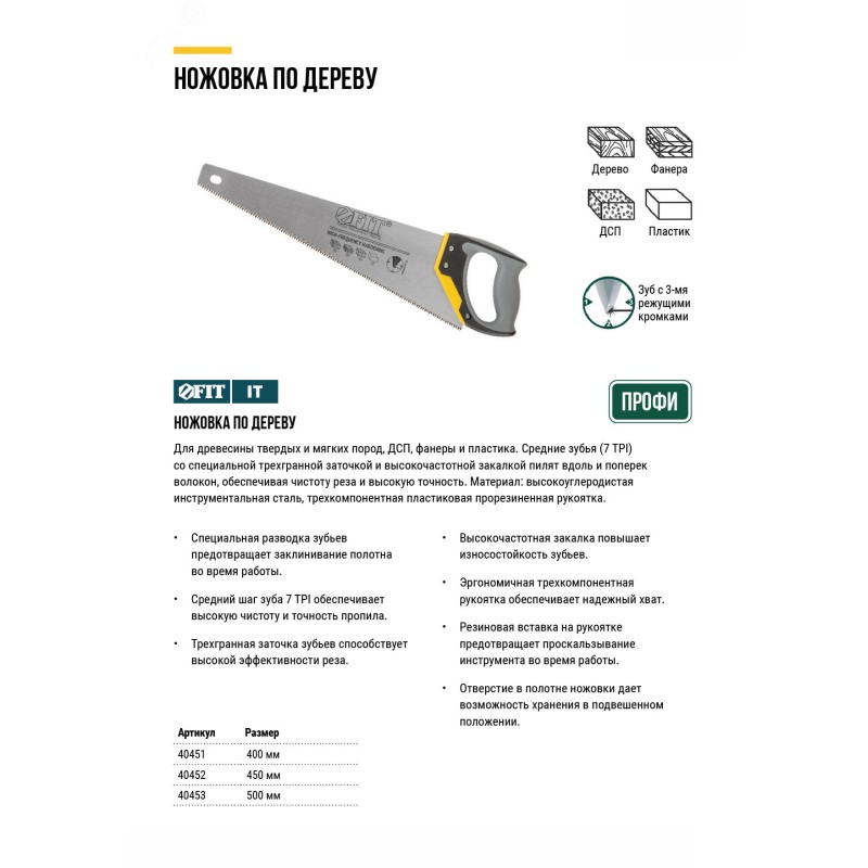 - Преимущества:Специальная разводка зубьев предотвращает заклинивание полотна во время работы|Средний шаг зуба 7 tpi обеспечивает высокую чистоту и точность пропила|Трехгранная заточка зубьев способствует высокой эффективности реза|Высокочастотная закалка повышает износостойкость зубьев|Эргономичная трехкомпонентная рукоятка обеспечивает надежный хват|Резиновая вставка на рукоятке предотвращает проскальзывание инструмента во время работы|Отверстие в полотне дает возможность хранения в подвешенном положении