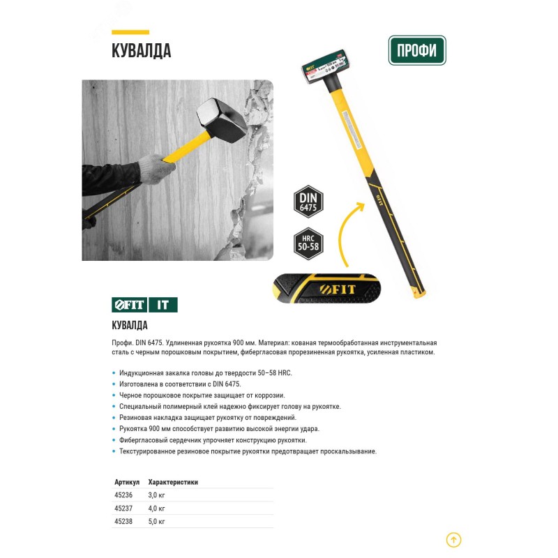 Голова изготовлена в соответствии с DIN 6475 из закаленной стали методом ковки с целью повышения ударостойкости. Индукционная закалка головы до твердости 50-58 HRC. Черное порошковое покрытие защищает от коррозии. Специальный полимерный клей надежно фиксирует голову на рукоятке. Рукоятка 900 мм способствует развитию высокой энергии удара. Фибергласовый сердечник упрочняет конструкцию рукоятки. Текстурированное покрытие рукоятки предотвращает проскальзывание.