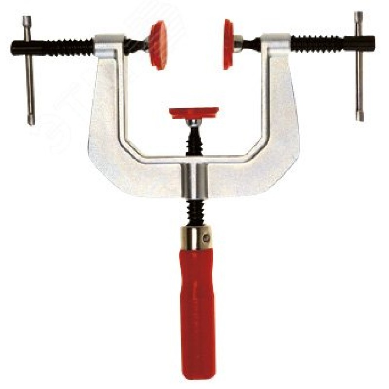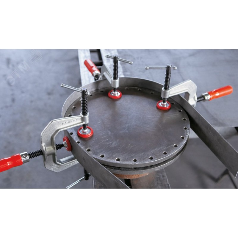 - Преимущества:C-образная струбцина с тремя винтами|Высокая устойчивость благодаря кованым скобам|Для дерева и металла|Подходит для сварки
