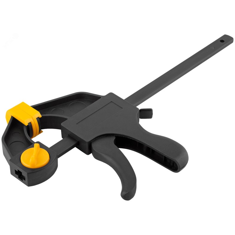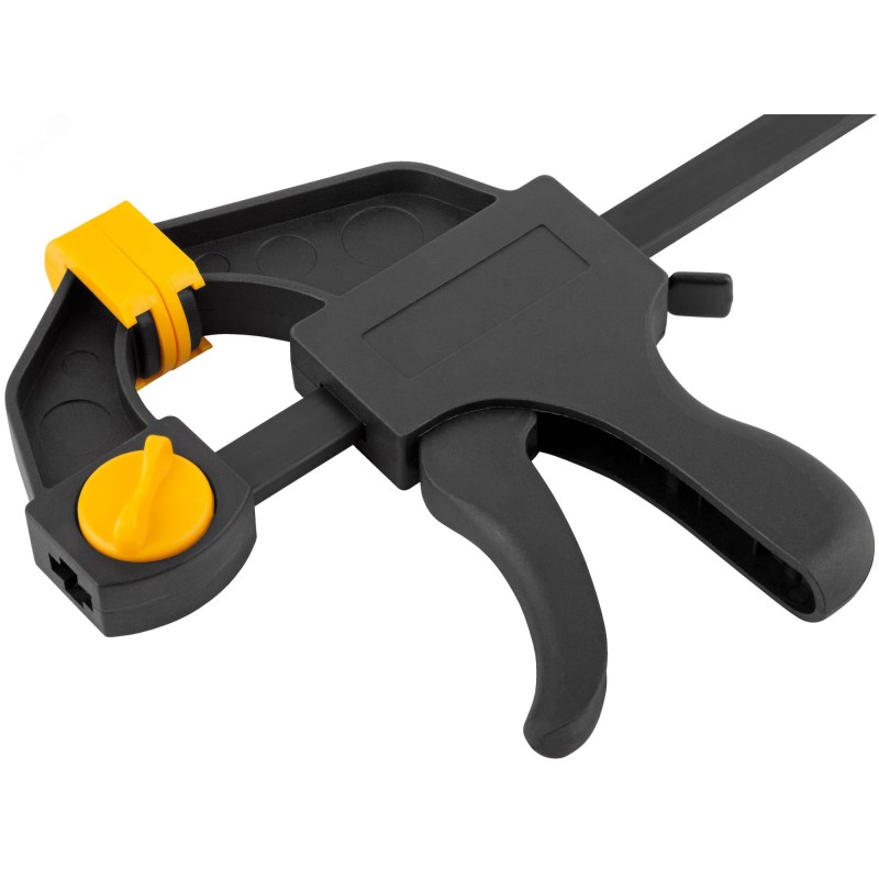 Быстрозажимная. Для фиксации деталей. Может использоваться как распорка при перестановке губок. Материал: нейлоновый корпус, армированный фибергласом, направляющая из инструментальной стали, пластиковые губки.