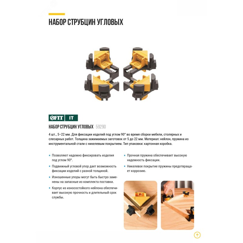 Для фиксации изделий под углом 90 градусов во время сборки мебели, столярных и слесарных работ. Толщина зажимаемых заготовок от 5 до 22 мм. Материал - нейлон, пружина из инструментальной стали с никелевым покрытием. Упаковка - картонная коробка.