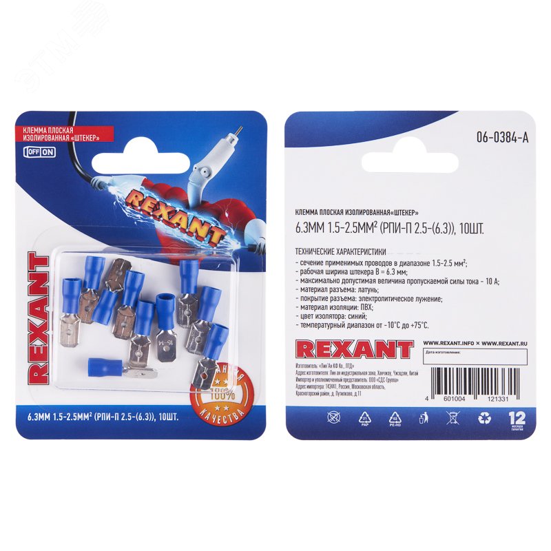 Клемма плоская изолированная REXANT предназначена для создания качественного подключения электрооборудования или соединения проводов между собой, которое при необходимости возможно разъединить без лишних усилий. Такая клемма используется для оконцовывания многожильных медных проводов при монтаже мобильных электрических контактных соединений на подвижном составе (автомобиле-, вагоно-, самолето- и судостроении). Клемма REXANT состоит из металлического коннектора (штекер) из латуни, с поверхностным электролитическим лужением и защитного изолятора клеммы из поливинилхлорида, который надежно защищает место обжима кабеля. Обжатие производится специальными пресс-клещами (ht-301H арт.12-3014, 12-3014, ht-301N арт.12-3116,ht-301 W арт.12-3021,12-3021-4) поверх защитного изолятора. Каждая клемма имеет отверстие, служащее фиксатором замкового типа для прочного соединения с гнездовым разъемом.