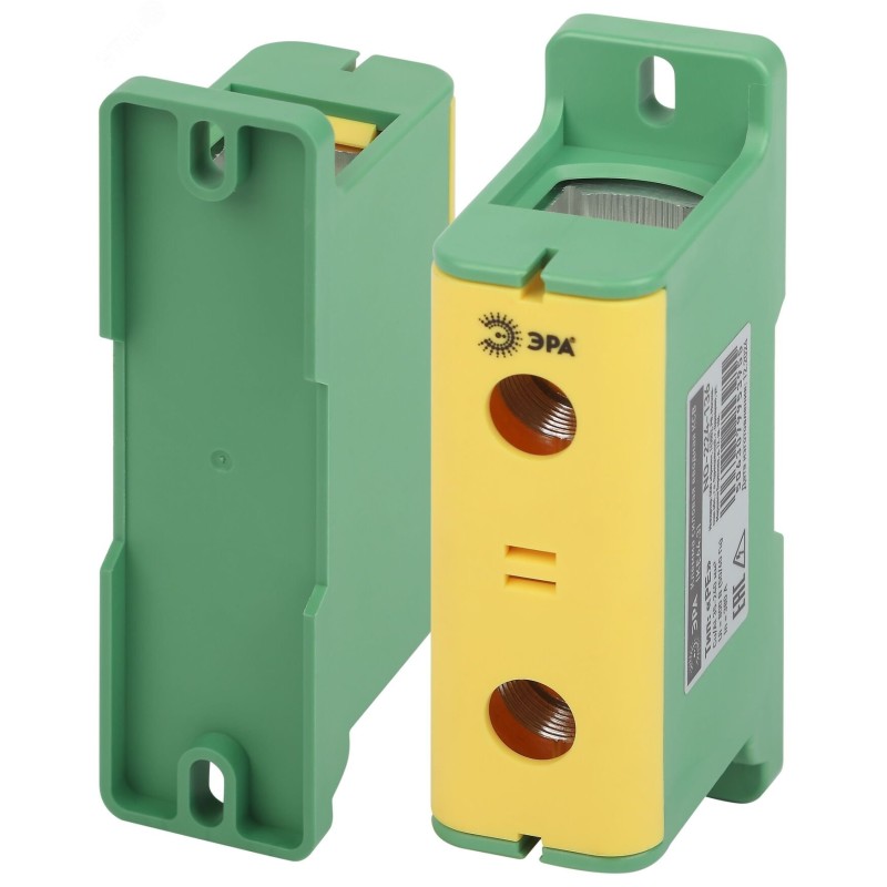 Клеммы силовые вводные КСВ ЭРА представляют собой клеммный винтовой зажим из алюминия в компактном корпусе из диэлектрического негорючего пластика. Предназначены для организации ввода и распределения проводников больших сечений (от 6 до 240 мм2) внутри электротехнических шкафов и щитов, а также в качестве переходного элемента при соединении проводников, дополнительных элементов для подключения и установки промышленного оборудования в цепях переменного или постоянного тока напряжением до 800 В. Токоведущая часть выполнена из алюминия, обладает ребристой поверхностью на внутренней части, что обеспечивает надёжную фиксацию при затягивании контакта, - прижимные винты с шестигранной головкой изготовлены из оцинкованной стали и обладают скруглённой контактной частью, что исключает перекусывание и повреждение подключаемых проводников.