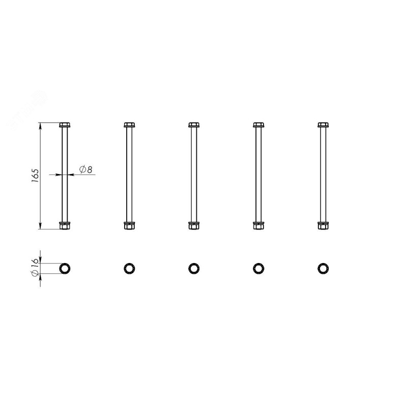 Комплект метизов предназначен для надёжной фиксации верхней и нижней частей шинодержателей для высоты токоведущей шины 80 мм. В комплект входят болты из оцинкованной стали длиной 160 мм, гайки, плоские шайбы и шайбы гровер. Класс прочности болтов 8х8, резьба М8.