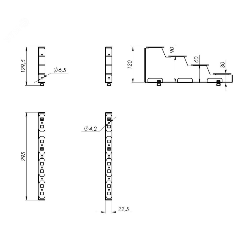 Опорные кронштейны из оцинкованной стали для 4-полюсной ступенчатой шинной системы. Предусматривает винтовое крепление изоляторов.