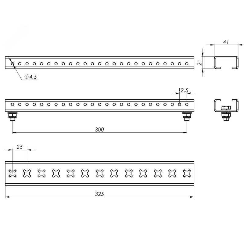 Рейки из оцинкованной стали длиной 325 мм обеспечивают установку изоляторов и других элементов держателя главной системы шин.