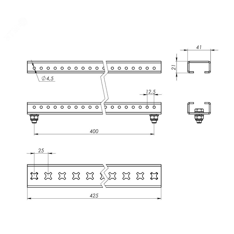 Рейки из оцинкованной стали длиной 425 мм обеспечивают установку изоляторов и других элементов держателя главной системы шин.