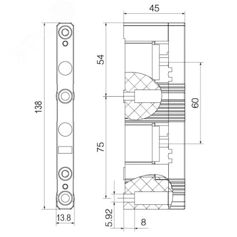 Держатель универсальный с межфазным расстоянием 60 мм для шин толщиной 5 или 10 мм, 2 полюса. Предназначен для построения системы токоведущих шин НКУ в шкафах навесного или напольного исполнения. Возможна установка шин шириной 12, 20, 30 мм. Подтвержденная стойкость к токам короткого замыкания Icw