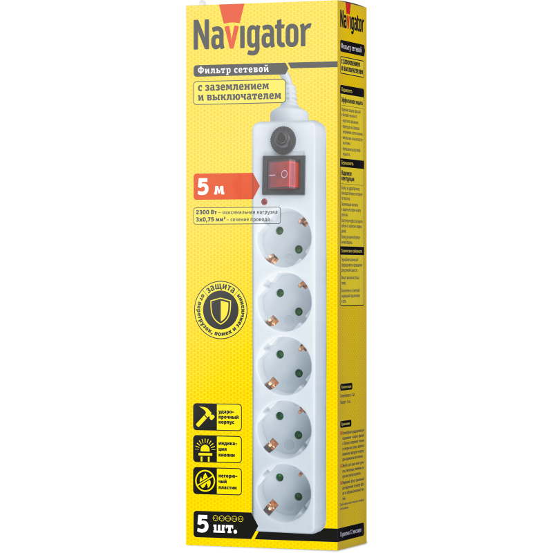 Сетевой фильтр Navigator серии NSP предназначен для защиты бытовой и офисной техники от короткого замыкания, импульсных и высокочастотных помех, превышения допустимой мощности, а также перегрузок и всплесков напряжения в сети питания. Идеально подходит для дома и офиса, удобен и безопасен в использовании.