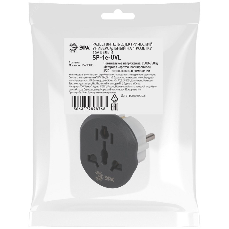 Разветвитель электрический SP-1e-UVL универсальный на 1 розетку 16А белый
