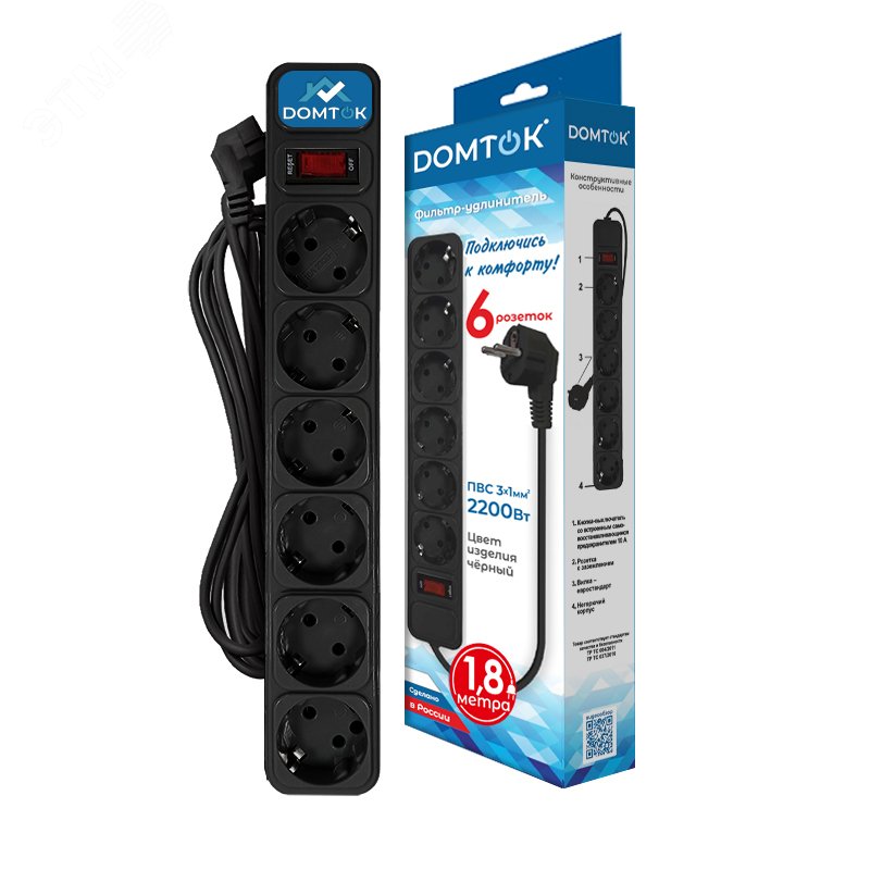 Фильтр-удлинитель DOMTOK сглаживает скачки напряжения питания и устраняет импульсные помехи при питании устройств от электросети. Это делает работу электронной техники более стабильной и продлевает ей жизнь. Кроме того, фильтр-удлинитель защищает подключенные через него электроприборы и оборудование от выхода из строя по причине перенапряжения. Фильтры-удлинители с шестью розетками.