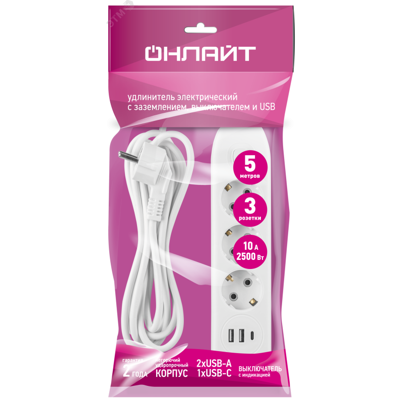 - Преимущества:Корпус из ударопрочного пластика, не поддерживающего горение|Контакты из латуни не подвержены коррозии, внутренняя конструкция удлинителя гарантирует надежный контакт в течение всего процесса эксплуатации|Три USB-разъема (2хUSB-A + USB-C, 2,4 А, 5 В) для подключение и зарядки электронных устройств|Выключатель с индикатором позволяет включать и выключать питание одним нажатием|Розетки расположены под углом для удобства подключения нескольких приборов|Вилка эргономичной формы из негорючего ПВХ-пластика|Гибий провод ПВС