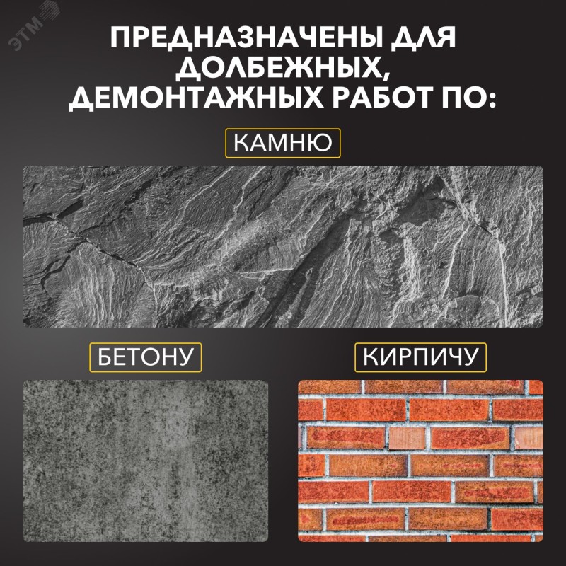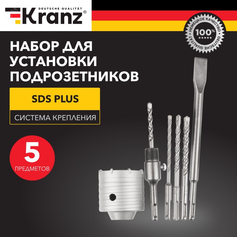 Набор KRANZ (5 предметов) применяется для перфораторов с типом крепления SDS PLUS для установки подрозетников, а также при долбежных и демонтажных работах по кирпичной кладке, бетону, природному и искусственному камню.