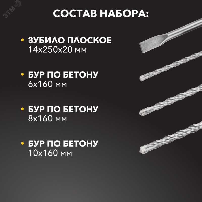 Ускоренное бурение|Улучшенная форма бура для отвода шлама|Высокий ресурс победитового наконечника|Удобное хранение за счет компактных габаритов|Металлический кейс в комплекте