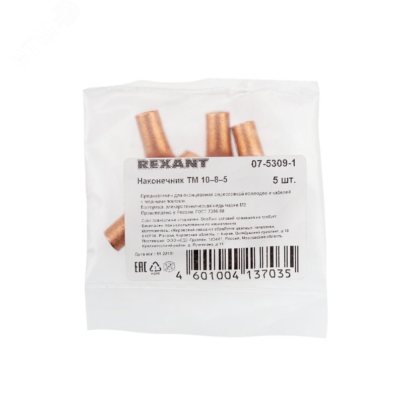 Наконечник кабельный, медный (без покрытия) предназначен для оконцевания опрессовкой проводов и кабелей с медными жилами. Изготавливается по ГОСТ 7386-80. Наконечник кабельный ТМ применяется в агрессивной среде, что обеспечивает защиту от разрушения основного материала. Структура обозначения -Т - Труба - полуфабрикат, из которого изготовлен наконечник. М - Медь - материал, из которого изготовлен наконечник. 10 - номинальное сечение наконечника, мм.кв. 8 - диаметр контактного стержня, мм. 5 - внутренний диаметр хвостовика, мм.