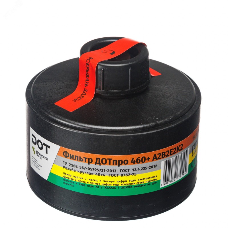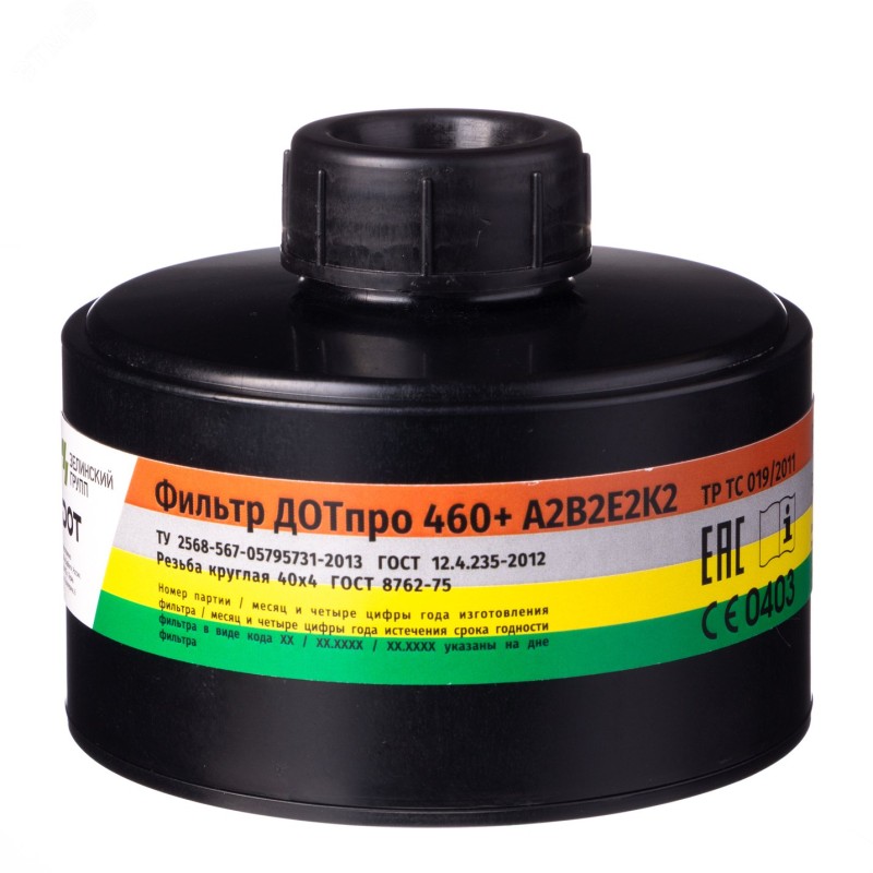Противогазовый фильтр в полимерном корпусе с резьбовым соединением. Обладает увеличенным временем защитного действия по циклогексану, циановодороду, сероводороду, диоксиду серы, хлору. Защита от органических паров с температурой кипения выше 65о С, органических паров с температурой кипения ниже 65°С, неорганических и кислых газов и паров, аммиака и его органических производных. Применяется в составе противогаза промышленного фильтрующего ДОТпро.