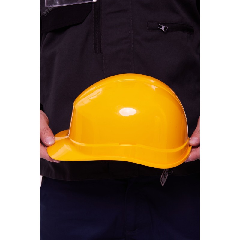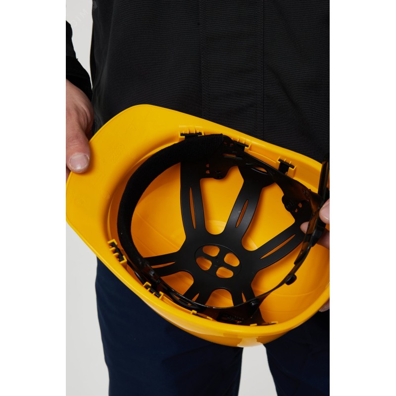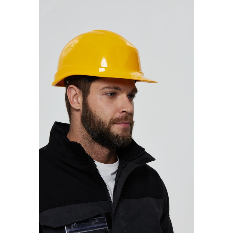 Защитная каска из полиэтилена высокой плотности (HDPE) или полипропилена (PP), устойчивая к УФ-лучам. Внутренняя оснастка из полиэтилена низкой плотности с 8-точечным креплением. Потовпитывающая вставка на лобовой части оголовья. Карманы для крепления очков, наушников, щитков. Ручная регулировка по обхвату головы от 53 до 63 см при помощи крепления скользящего типа. Защита против случайного кратковременного контакта с электрическим проводником под напряжением 440 В переменного тока.