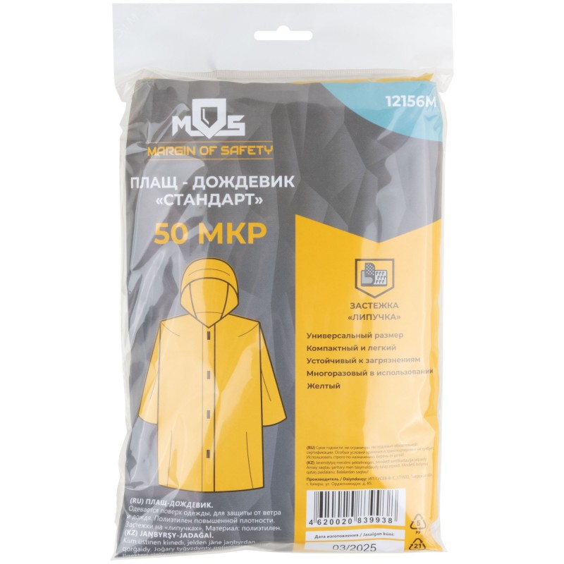 Плащ-дождевик MOS предназначен для ношения поверх одежды в целях защиты от дождя и ветра. Изготовлен из плотного полиэтилена, что обеспечивает прочность и долгий срок службы изделия. Застежки на липучках, капюшон и удлиненные рукава обеспечивают надежную защиту даже от сильного дождя. Удобен в хранении и транспортировке, так как почти не занимает места в сложенном состоянии.