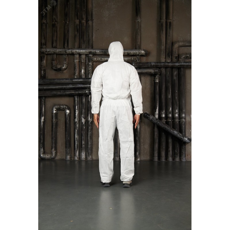 Комбинезон с эластичным капюшоном DT117 , белого цвета. Двухзамковая застежка-молния, закрытая защитной планкой. Эластичная резинка вокруг лицевого выреза капюшона, на талии и лодыжках. Трикотажные манжеты. Индивидуальная упаковка.