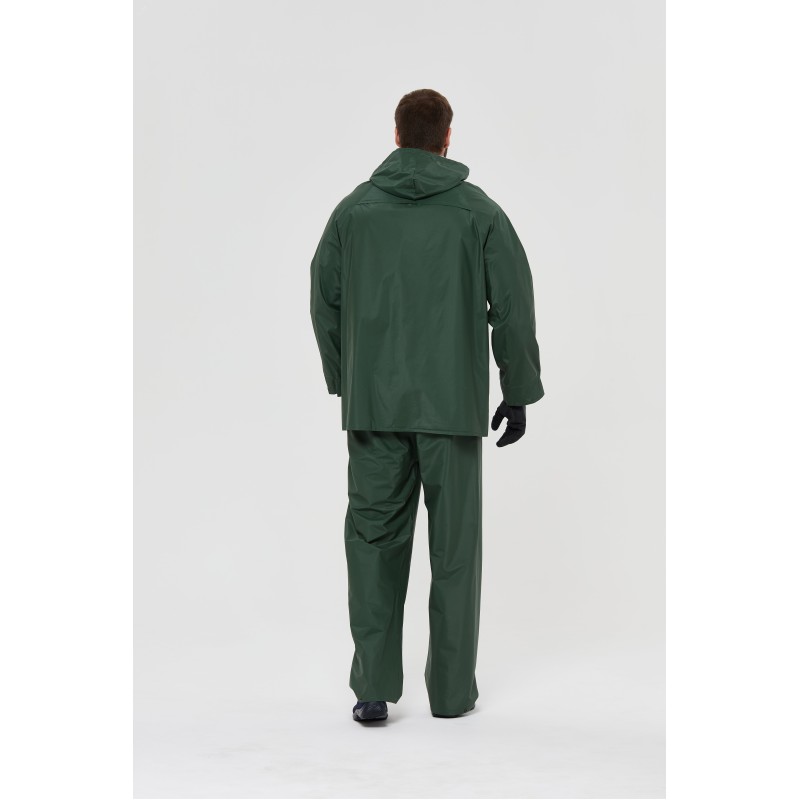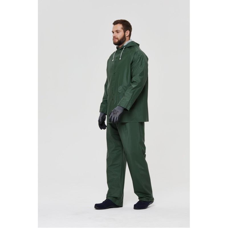 Универсальный влагозащитный костюм для использования в помещении и на улице, состоящий из куртки и брюк, с двусторонним (внешним и внутренним) ПВХ-покрытием для защиты от неблагоприятных погодных условий. Комфорт и удобство использования благодаря пропаянным швам, наличию капюшона, эластичной ленте в поясе брюк, а так же наличию трех карманов. Куртка имеет застежку-молнию с ветрозащитной планкой на кнопках, низ брюк регулируется кнопками.