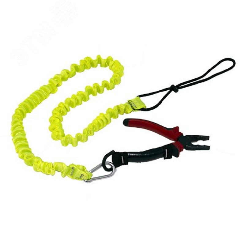 Эластичный строп для защиты от падения инструмента (не предназначен для страховки рабочего). Выдерживает груз до 20 кг. Строп в состоянии покоя имеет длину 60 см, растягивается до длины 130 см, благодаря этому свойству строп не мешается, не путается при работе. Эластичный строп имеет два крепления карабин и шнур с фиксатором. Инструмент можно крепить с помощью карабина за технологическое отверстие на инструменте, либо при помощи комплекта крепления инструмента от падения с высоты. Шнур с фиксатором крепить к руке, поясу, сумке.