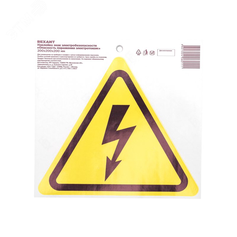 Знак электробезопасности (наклейка) ‘Опасность поражения электротоком ‘ предназначен для размещения на электрооборудовании и приборах, опорах линий электропередачи, дверцах силовых щитков, на электротехнических панелях и шкафах, а также на ограждениях токоведущих частей оборудования, механизмов, приборов, с целью сообщения об опасности поражения электротоком. Знак изготовлен на основе самоклеящейся пленки, предназначенной для информационных знаков на улице и в помещениях. Знак хорошо виден и сохраняет яркость цветов долгое время даже при постоянном использовании. Имеет хорошую устойчивость к смазыванию, стойкость к прямым солнечным лучам, перепадам температуры, мелким механическим воздействиям. Выполнен из прочного, износостойкого материала, легко клеится, крепко держится и не оставляет следов после снятия.