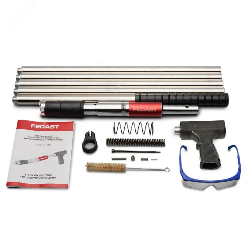 - Комплектация:пороховой монтажный пистолет FEDAST H8 – 1 шт|рукоятка 204-ZP102X – 1 шт|удлинительные стержни, комплект – 5 шт|щетка круглая – 1 шт|защитные очки – 1 шт|фиксатор, набор – 1 шт|кейс – 1 шт|инструкция – 1 шт