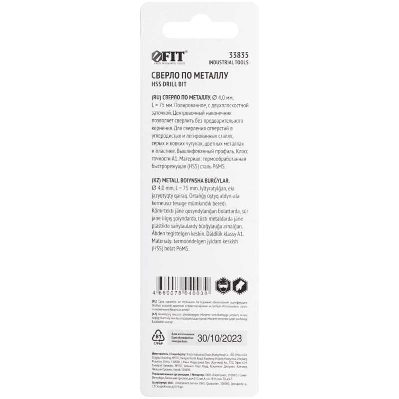 - Тип изделия:Сверло по металлу