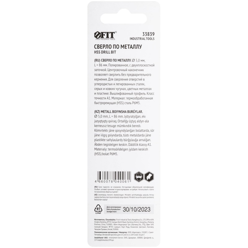 - Тип изделия:Сверло по металлу