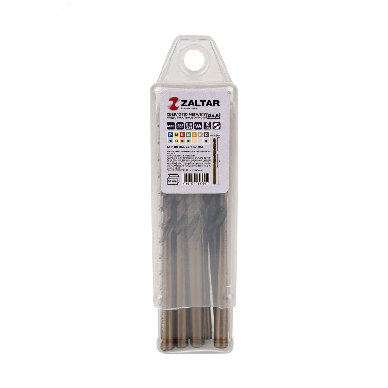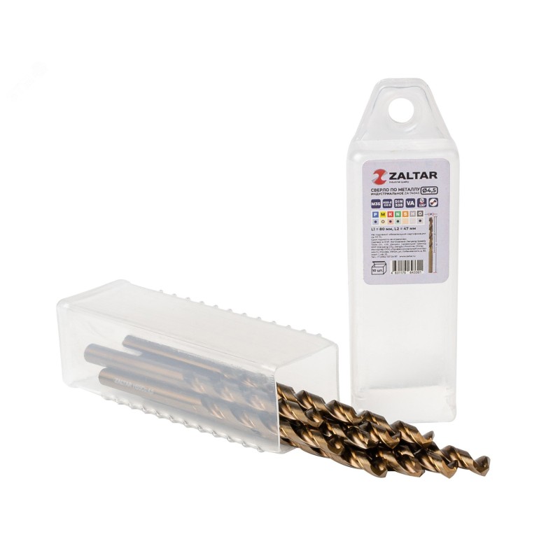 - Дополнительная информация:количество в наборе, шт - 10|технический стандарт - DIN 338|материал - HSS-E Co5|тип сверла - VA|диаметр сверла, мм - 4.5|рабочая длина, мм - 47|длина, мм - 80|глубина реза - 5xD|угол заточки, градусов - 130|угол спирали, градусов - 36|тип хвостовика - цилиндрический|тип заточки - DIN1412-C - крестообразная подточка перемычки