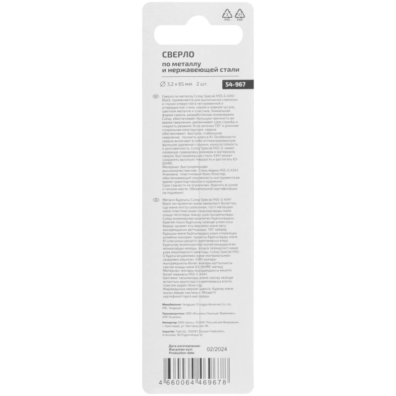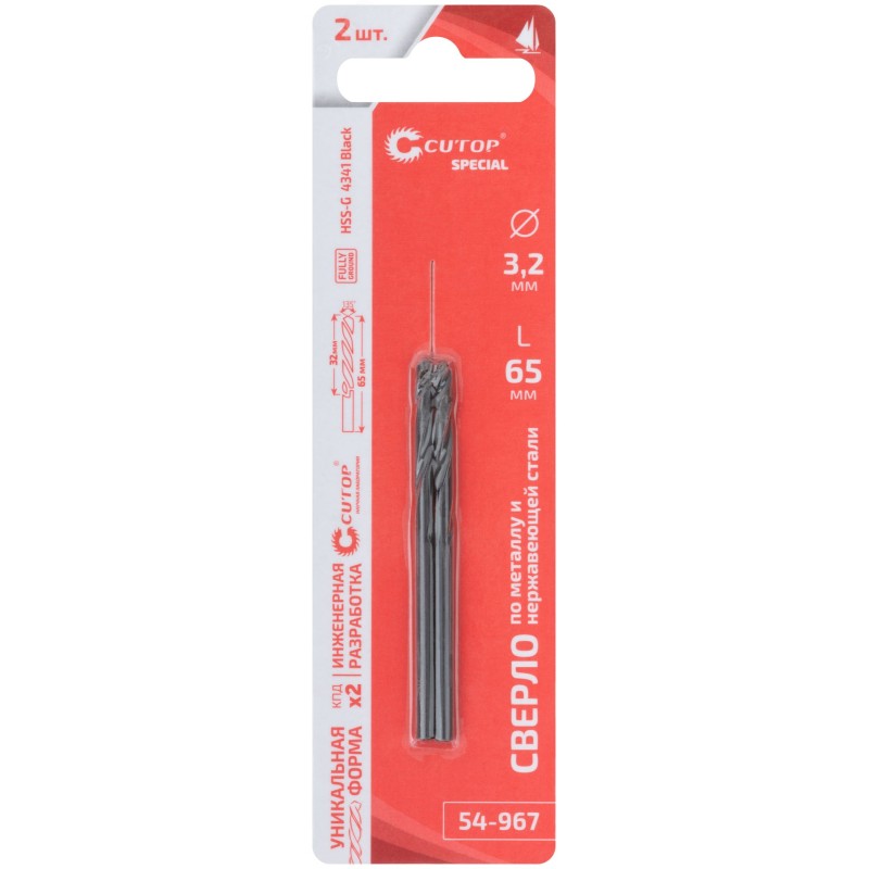 Сверло по металлу HSS-G Cutop Special применяется для выполнения сквозных/глухих отверстий в металлических заготовках – легированная и углеродистая сталь, серый и ковкий чугун, цветной металл и пластик. Цилиндрический хвостовик у сверл диаметром от 2мм до 5,5мм. Трехгранный хвостовик у сверл диаметром от 6мм до 13мм. Угол заточки 135, класс точности А1 и длинная спиральная конструкция сверла обеспечивают быстрое, стабильное сверление. Сверла HSS-G имеют повышенную твердость благодаря полной шлифовки режущей поверхности нитридом бора. Это обеспечивает высокое качество обработки стенок отверстий. Лазерная маркировка размера и материала сверла. Материал – быстрорежущая высококачественная сталь HSS-G (63-67 HRC). Упаковка – подвесной пластиковый бокс / блистер.