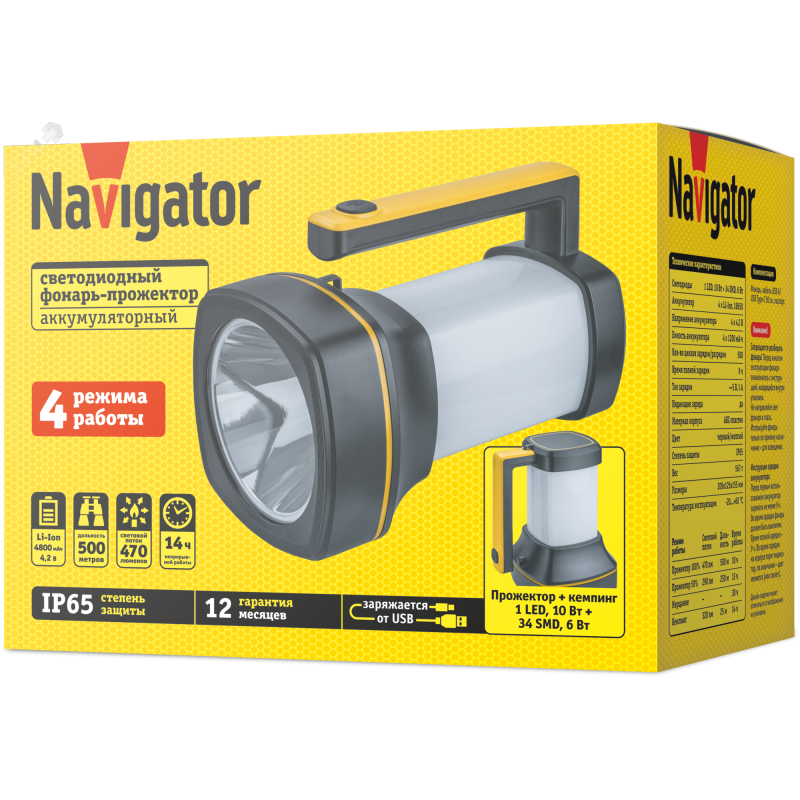 - Преимущества:Фонарь ''2 в 1'' - мощный прожектор 10 Вт + яркая лампа для кемпинга|4 режима работы - луч 100 и 50% яркости, мерцание, кемпинг|Четыре литий-ионных аккумулятора 1,2 А·ч обеспечивают до 14 часов автономной работы|Кабель USB A/USB Type-C длиной 50 см поставляется в комплекте|Индикатор заряда на корпусе фонаря|Высокая степень защиты от пыли и влаги IP65|Конструкция позволяет устанавливать фонарь на поверхность горизонтально и вертикально, а также удобно держать в руке