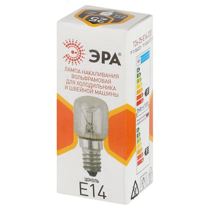 Лампа накаливания ЭРА T26-25-E14-230 25Вт 230В вольфрамовая различного назначения. Предназначена для освещения камер холодильников, швейных машин, для использования в сигнальных и других приборах, областью назначения которых не является освещение пространства в быту.