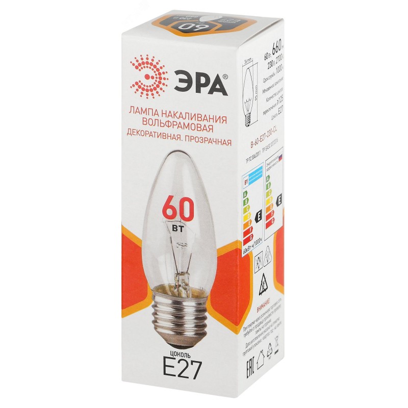 Лампа накаливания вольфрамовая для бытового и аналогичного общего освещения. Лампа с колбой в виде свечи используется для декоративного оформления светильника, придания ему законченного и совершенного вида. Она красиво смотрится, создавая эффект настоящей зажженной свечи, что привносит в интерьер комнаты более уютный, успокаивающий и ''теплый'' вид. Прозрачная колба лампы создана специально для эффектов абсолютно чистого, искрящегося света.