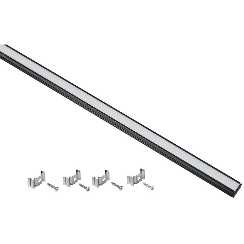 - Преимущества:Рассеиватель из поликарбоната мягко и равномерно распределяет свет и защищает ленту от механического воздействия|Черный матовый цвет профиля позволяет использовать его в проектах, подразумевающих черный дизайн|В комплекте с профилем поставляется всё необходимое для монтажа: торцевые заглушки, крепежные скобы и саморезы|Прочно крепится на разных поверхностях.