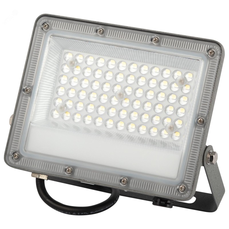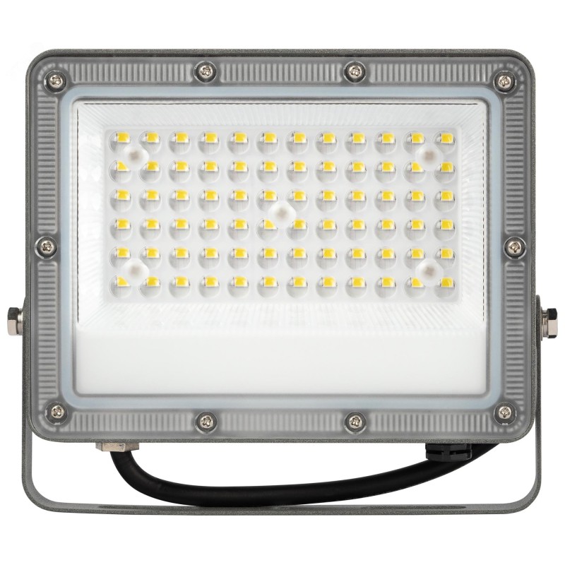 Прожектор светодиодный уличный с высоким световым потоком. Корпус – серый, изготовлен из прочного алюминия, имеет рассеиватель из поликарбоната с интегрированными линзами, имеет клапан выравнивания давления. Устойчив к механическим воздействиям, защищен от дождя и пыли, работает при широком диапазоне температур. Отличается простой и быстрой установкой – есть кронштейн специальной формы и регулировочные болты для выбора направления света. Длина кабеля 30 см.
