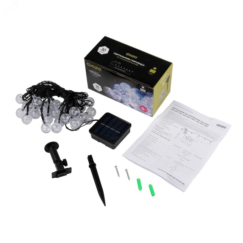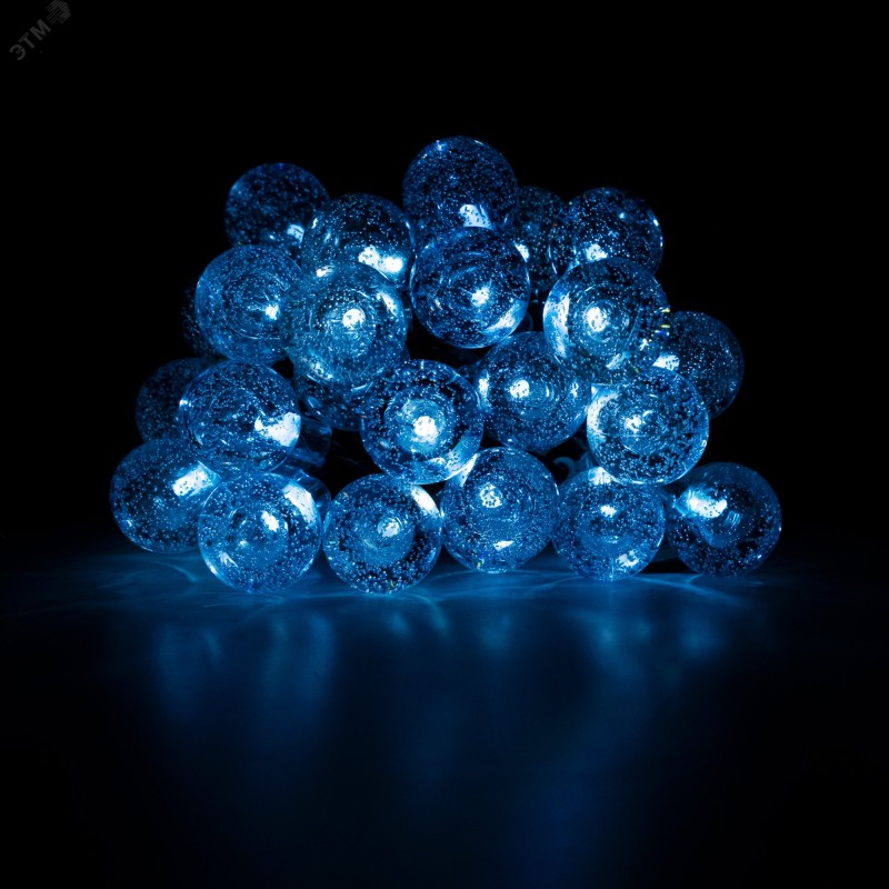 Светодиодный светильник-гирлянда 'КРИСТАЛЛИЧЕСКИЕ ШАРИКИ' с солнечной батареей. Предназначен для декоративной подсветки кустарников, альпийских горок, террас, веранд на садовых и дачных участках, балконов и т.п. Автоматическое включение/выключение при наступлении темного/светлого времени суток (датчик освещенности). 8 режимов работы - комбинированный, волнообразный, последовательный, перетекающий, бегущая вспышка, затухающий, мерцающий, постоянный. Время непрерывной работы при полностью заряженном аккумуляторе 8 часов. Светильник можно устанавливать в грунт и на вертикальную поверхность. Крепеж (два самореза и дюбеля) входит в комплект поставки.
