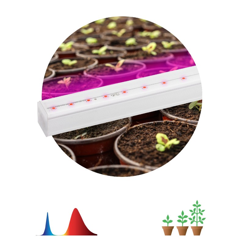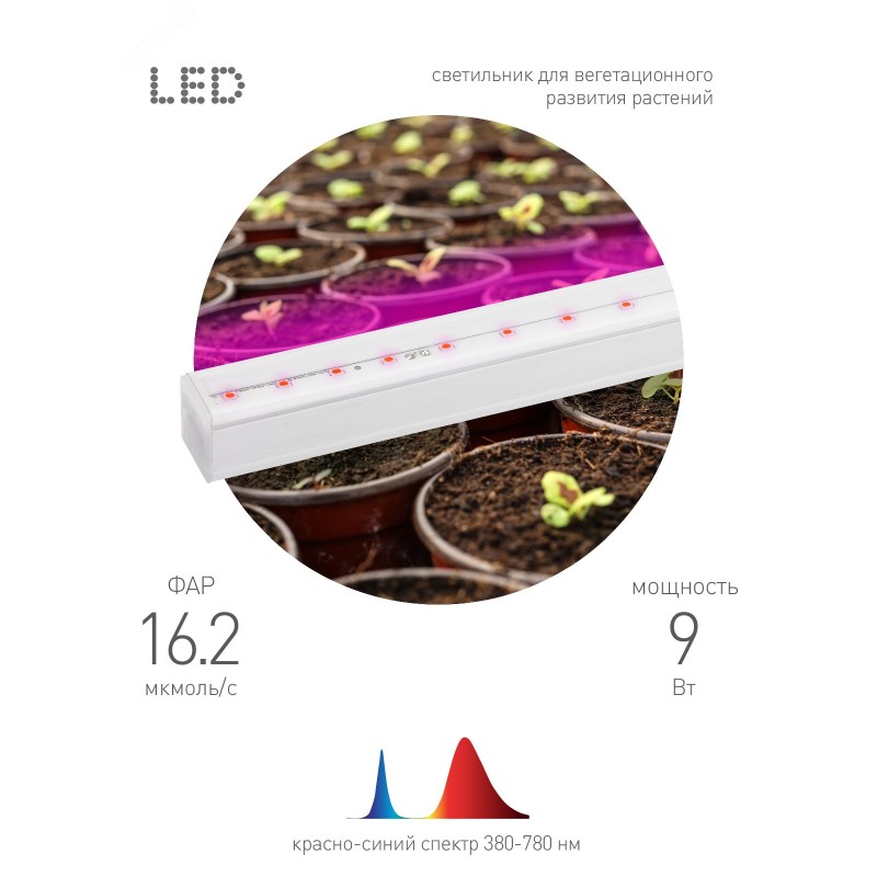 Светильник для растений ЭРА FITO-9W-Т5-N предназначен для выращивания зелени, рассады пасленовых, а также для досвечивания комнатных цветов. Спектр свечения светильника фиолетовый со сдвигом в розовую часть, соотношение синего к красному - 2 к 3. Сдвиг в область красного с добавлением свечения в области дальнего красного позволяет светильнику обеспечить питание корням и листьям и предотвратить вытягивание растений. Данная модель отличается прозрачным рассеивателем, крепким корпусом с хорошим теплоотводом. Диоды в светильнике работают в дефорсированном режиме, что обеспечит его долгий срок службы и хорошую светоотдачу. Рекомендованное расстояние от светильника не более 35 см до листьев растений. Минимальное расстояние не менее 5 см.