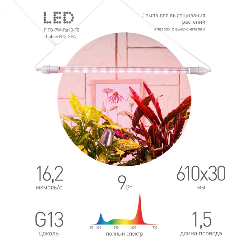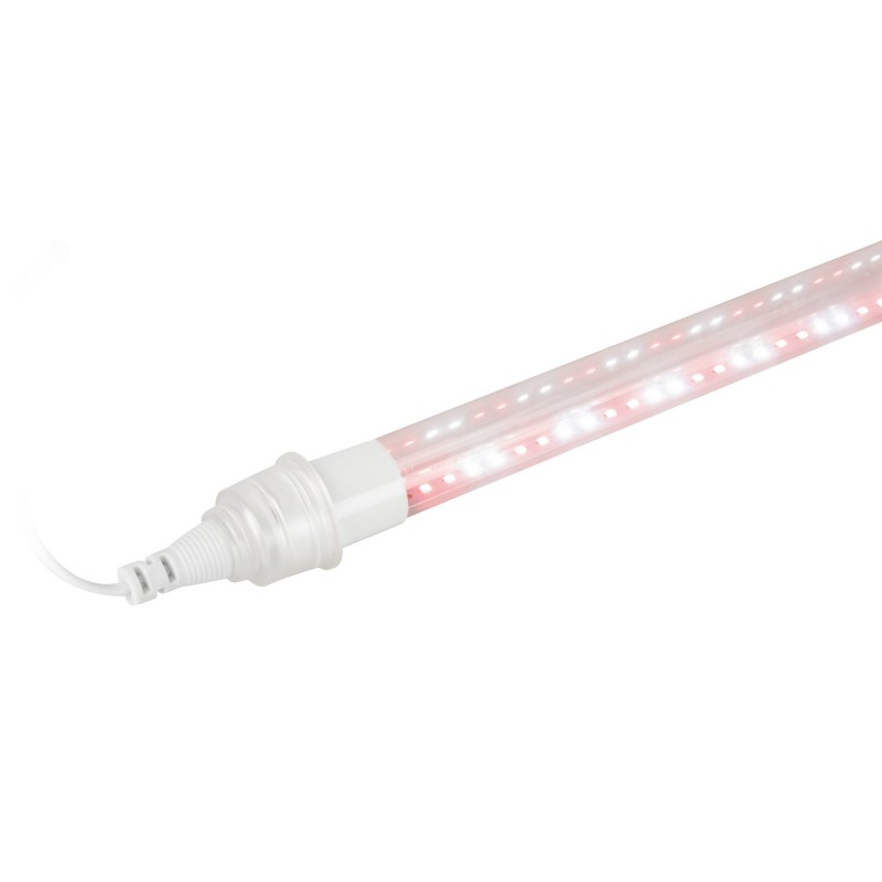 Линейный фитосветильник FITO-9W-Ra90-Т8+holderG13 полного спектра IP 65 c выключателем и вилкой от ЭРА – светильник полного спектра, сертифицированный по ГОСТ 57671-2017, обеспечивает растения необходимым светом для здорового роста и развития. Благодаря 56 светодиодам, создающим направленное белое освещение, и прозрачному стеклу, усиливающему воздействие на растения, этот светильник гарантирует эффективное использование света. Его компактные размеры (60 см в длину и 2,7 см в диаметре) позволяют разместить его даже в ограниченном пространстве, а полутораметровый шнур питания обеспечивает удобство подключения. Линейный фитосветильник FITO-9W-Ra90-Т8+holderG13 идеально подходит для использования в жилых помещениях, гроубоксах и оранжереях. Площадь освещения составляет 0,7 м2, а для гидропонного выращивания рекомендуется использовать 25 ламп на 1 м2.