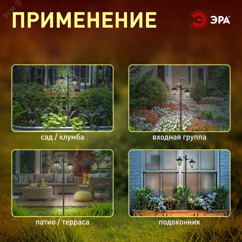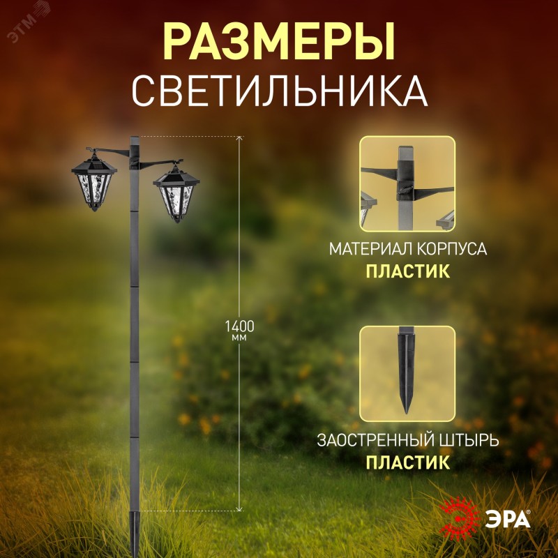 Светильник уличный на солнечной батарее высота 1,4 м 2 LED ЭРА ERASF23-28. В дневное время светильник подзаряжается естественным способом с помощью встроенной солнечной батареи, вечером автоматически включается, создаёт яркую дополнительную подсветку и красивый световой узор.