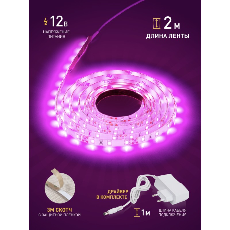 Светодиодная лента - 1 шт|Руководство по эксплуатации - 1 шт|Адаптер питания, 12В - 1 шт|Упаковка, комплект - 1 шт