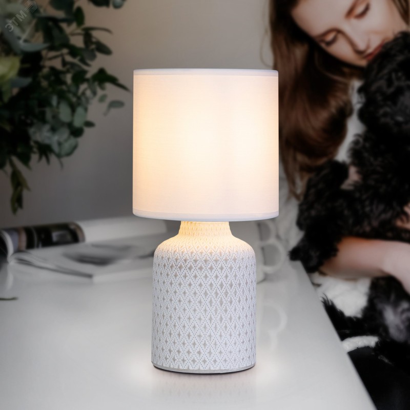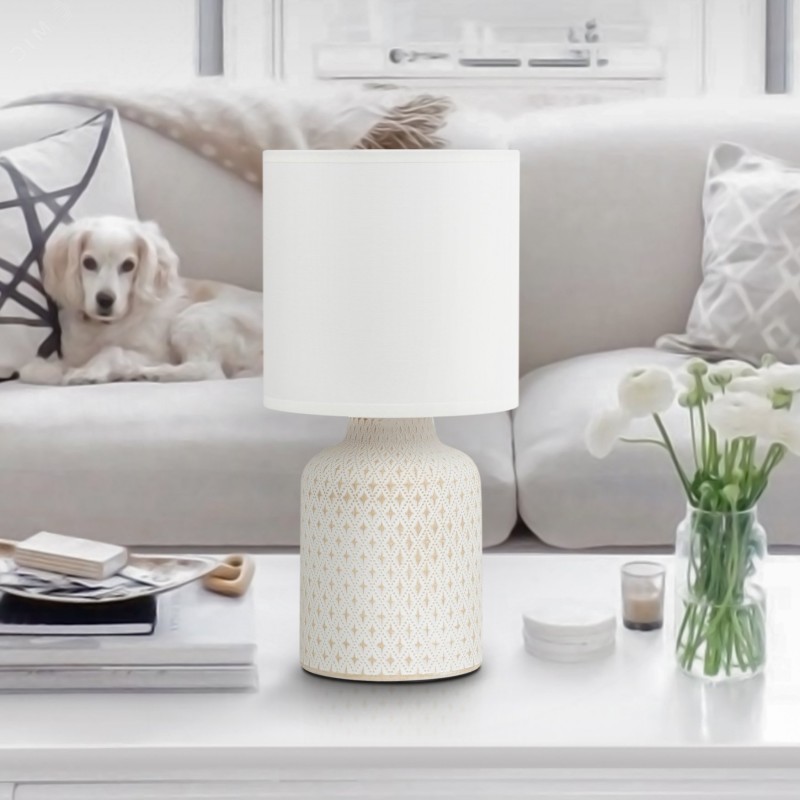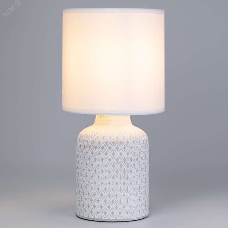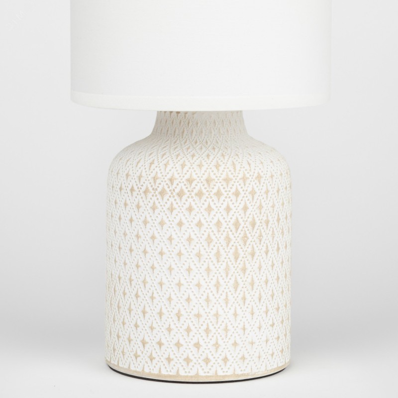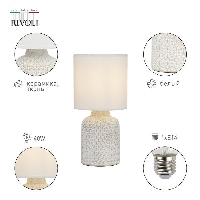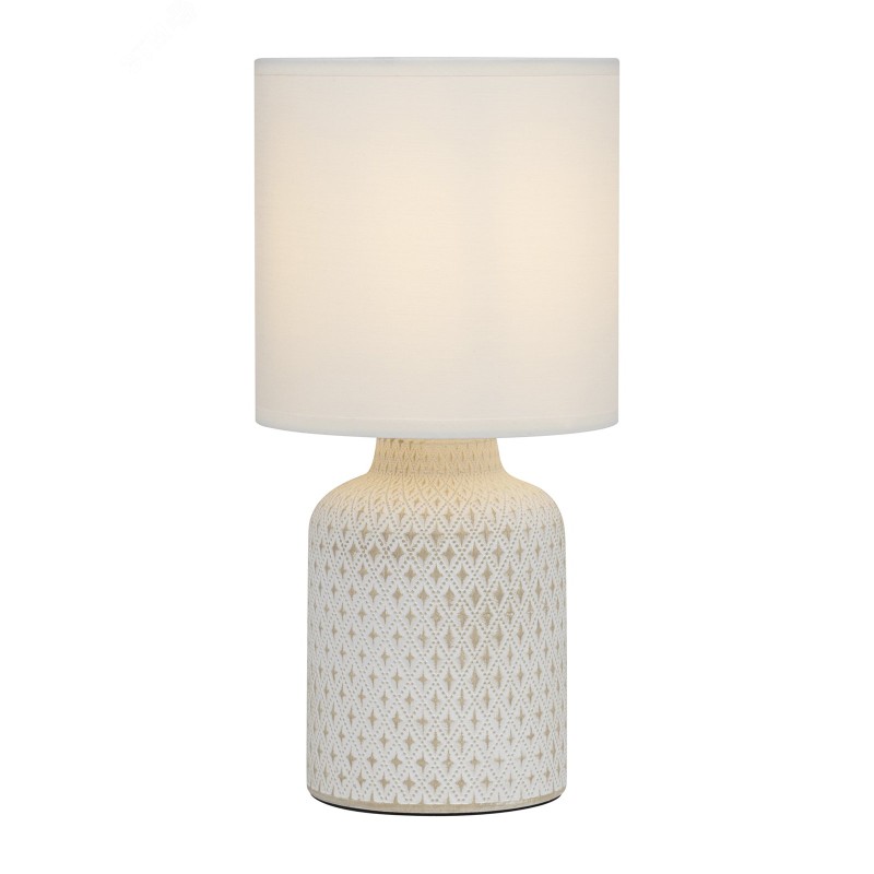 Rivoli Sabrina (арт. 7043-502) - настольный светильник бытовой интерьерный с тканевым абажуром изготовлена из керамики и ткани в актуальном эко-стиле. Керамическое основание имеет геометричные узоры, в которых угадываются восточные мотивы. Базовый цвет с легкостью впишет этот дизайнерский настольный светильник в любой интерьер. Настольные лампы Sabrina хороши для стилей классика, винтаж, восток, модерн, ретро. Важное преимущество, отличающее данные лампы настольные - натуральные материалы. Лампа настольная Sabrina с удобным выключателем на проводе является переносной. Легко переставлять из комнаты в комнату, выбирать для светильника самое удачное место в помещении - без демонтажа и за считанные секунды. Для работы настольной лампы нужно только вкрутить лампочку Е14 40 Вт и вставить вилку в сеть.