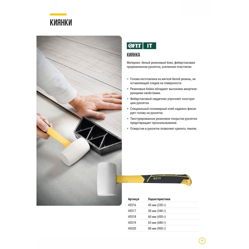Предназначена для сборки и демонтажа различных конструкций. Белая резина не оставляет следы на поверхности. Резиновые бойки обладают высокими амортизирующими свойствами. Фибергласовый сердечник упрочняет конструкцию рукоятки. Специальный полимерный клей надежно фиксирует голову с рукояткой. Текстурированное противоскользящее резиновое покрытие рукоятки.