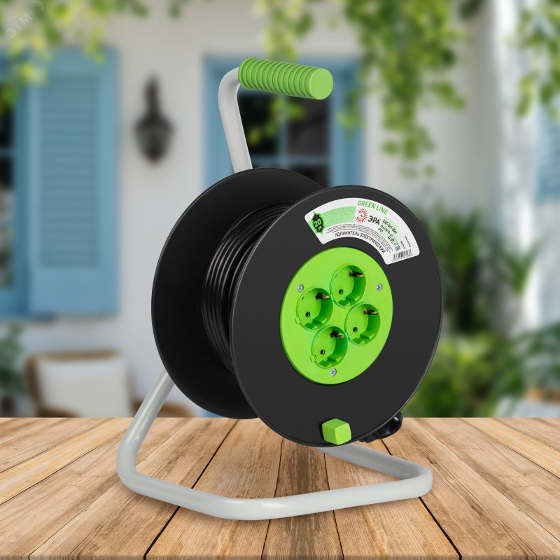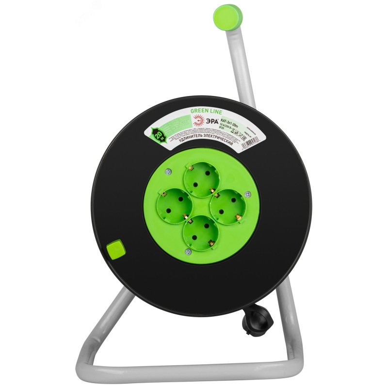 Удлинитель силовой ЭРА GREEN LINE на пластиковой катушке KAT-3x1-20m, 4 розетки с заземлением. Провод ПВС 3х1мм2, 20м. Мощность 10А/2200Вт. Используется для работы на строительных площадках или дачных участках. Удобен при работе с приборами, находящимися удаленно от стационарной розетки. Например, газонокосилки, электрические, пилы, триммеры или электродрели. Рама катушки сделана из высокопрочной стали, а пластиковой корпус катушки выполнен с применением негорючих добавок.